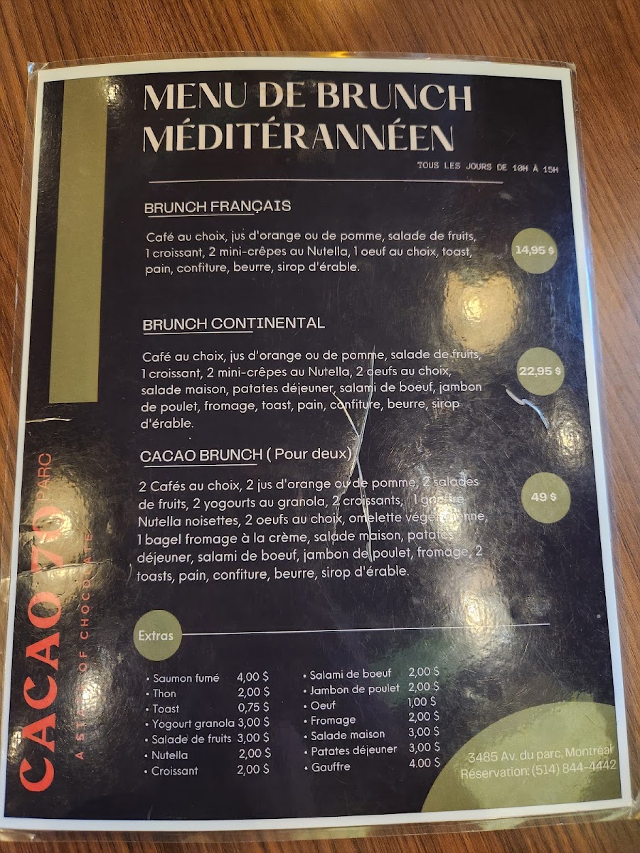Welcome to Cacao 70 Eatery, a hidden gem nestled in the vibrant heart of Montreal at 3485 Park Ave. This charming eatery is not just a paradise for chocolate lovers; it also boasts a diverse menu that marries savory delights with sweet indulgences. Whether you're in the mood for a comforting wrap filled with roasted vegetables or a decadent chocolate milkshake, Cacao 70 has something to satisfy every craving.